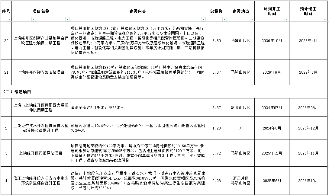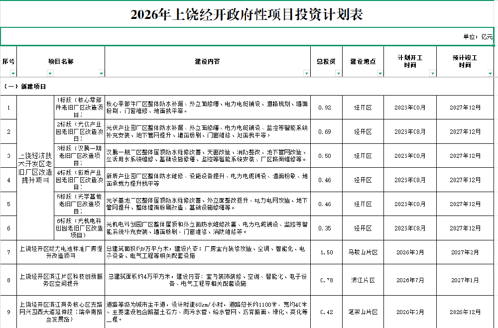 2026年上饒經開政府性項目投資計劃表